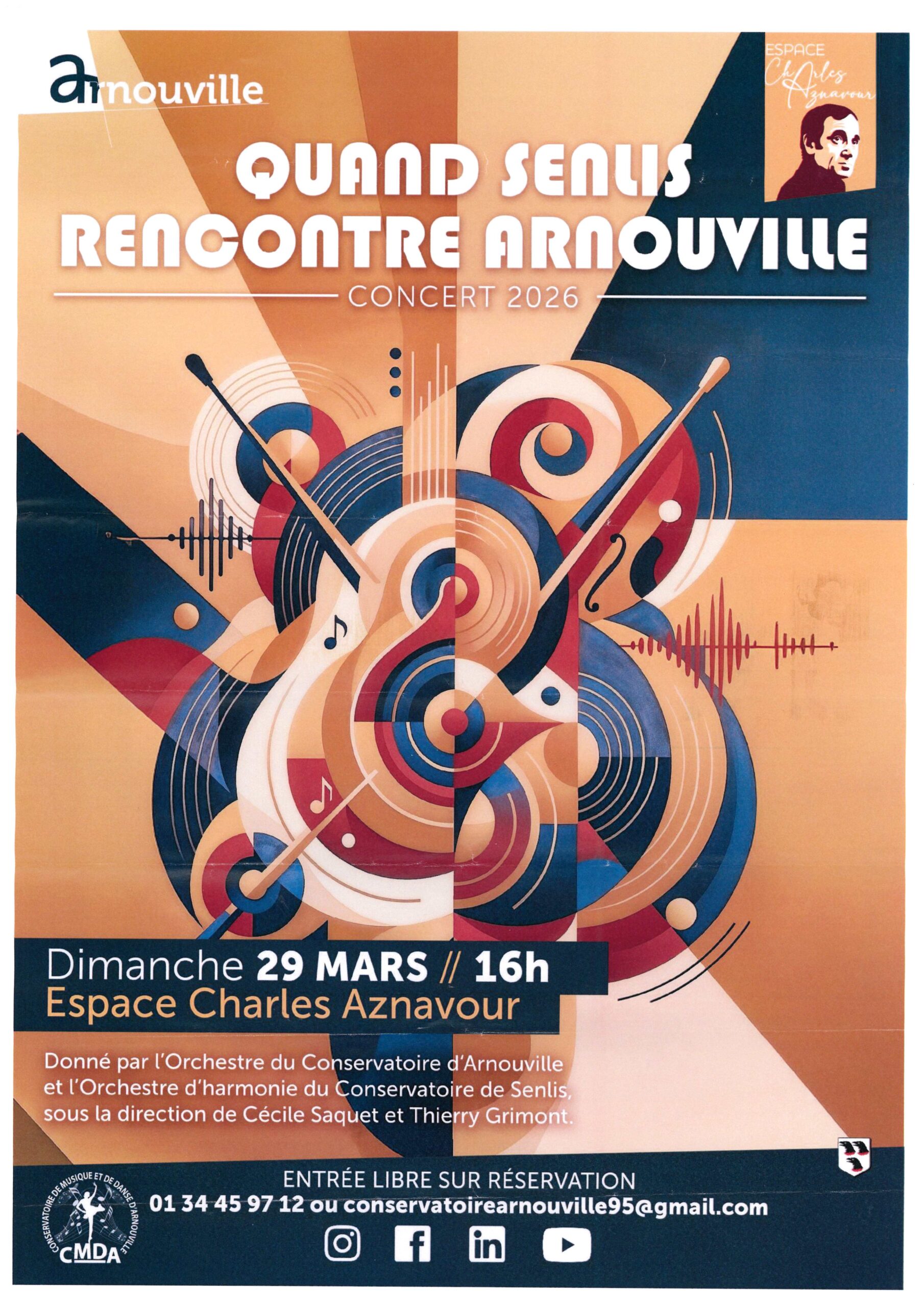 Concert de l’harmonie de Senlis avec l’harmonie d’Arnouville le dimanche 29 mars à 16h à l’Espace Charles Aznavour d’Arnouville.